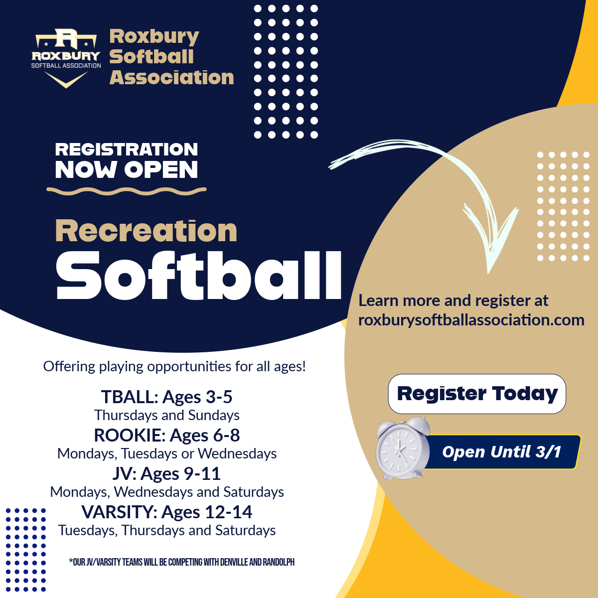 Varsity | Ages 12 - 14 Grades 6-9 | Majors Softball League moves up to a 12 inch ball with player pitch at 40 feet from home plate and a conventional 60 foot diamond. This competitive program is to prepare players to move to high school level play. This league will play combined games with Randolph Rec Softball and Denville Recreation so games will be played in Roxbury, Randolph and Denville.